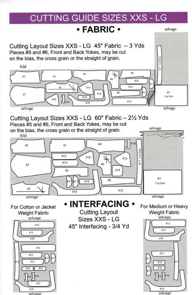 Most patterns will have a layout guide showing how the pieces could fit on the fabric, where the fold of the fabric is, where the selvedge edge of the fabric is, and whether the pattern is cut face up or face down. It will also show the number of pieces to cut, and if there are lining, interfacing, or other fabrics that need to be cut from the pieces.